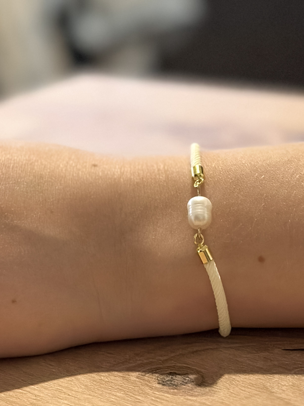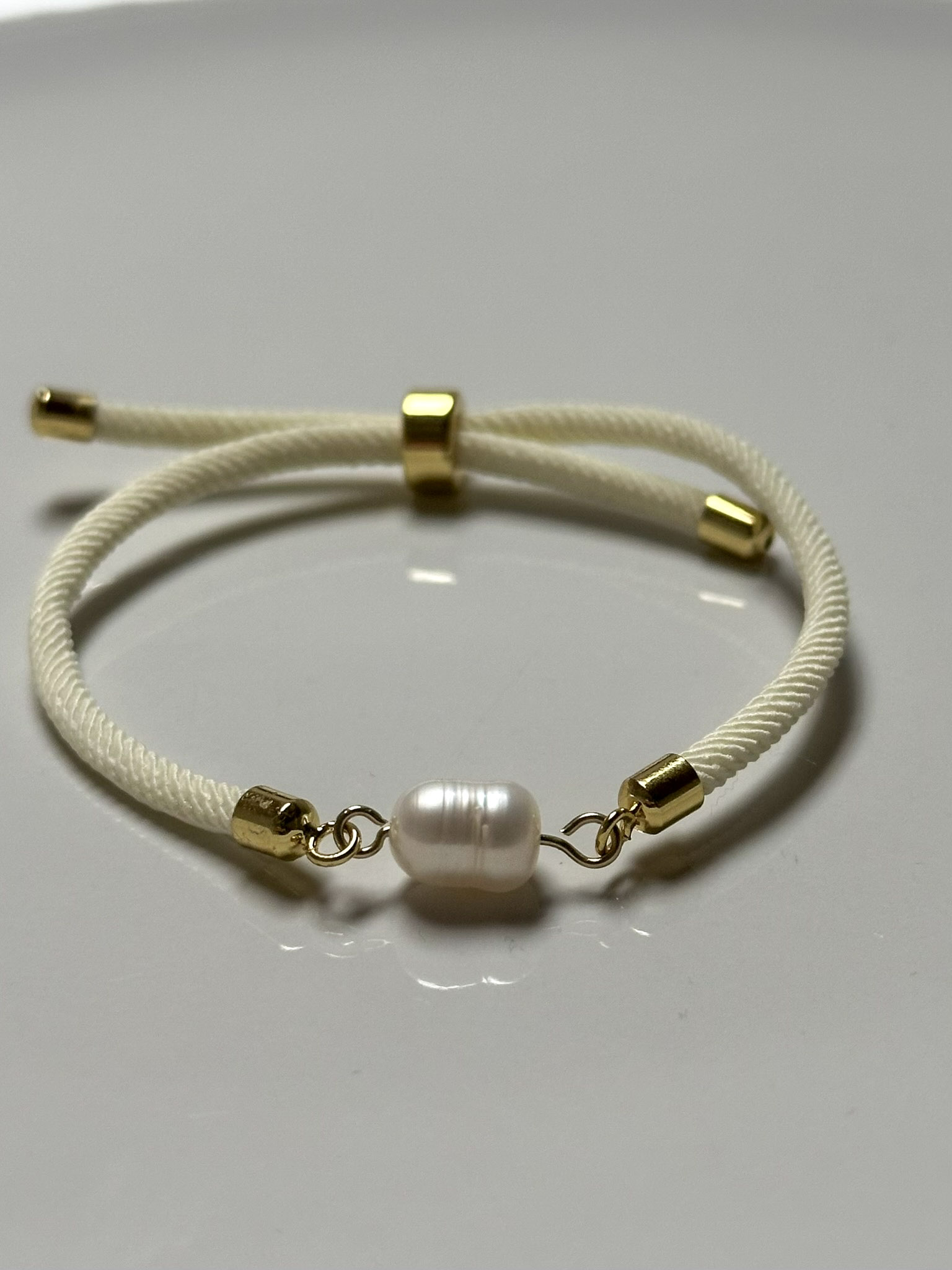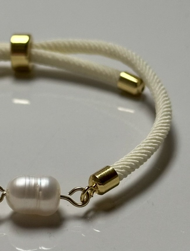 Perlu doplňují pozlacené komponenty, které náramku dodávají jemný luxusní nádech. Náramek je zhotoven z textilního lanka s posuvným zapínáním, díky kterému se snadno přizpůsobí téměř každému zápěstí a pohodlně se nosí po celý den.