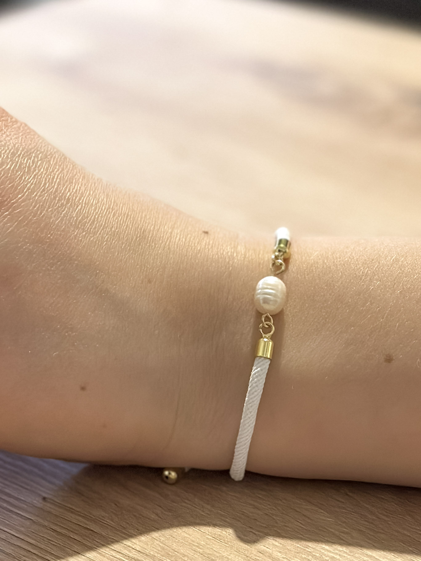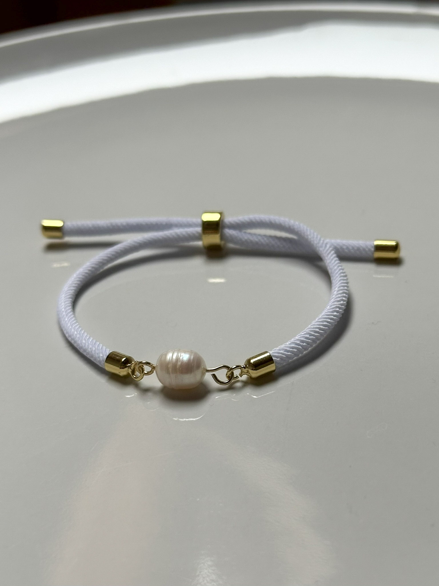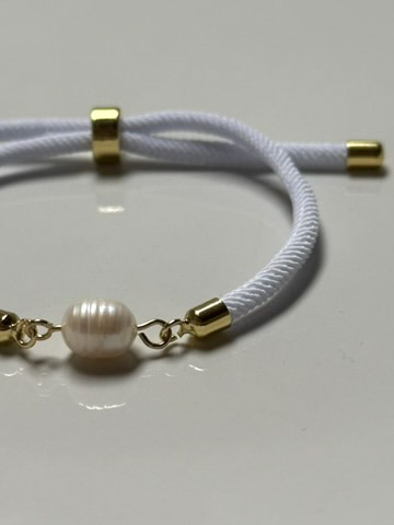 Perlu doplňují pozlacené komponenty, které náramku dodávají jemný luxusní nádech. Náramek je zhotoven z textilního lanka s posuvným zapínáním, díky kterému se snadno přizpůsobí téměř každému zápěstí a pohodlně se nosí po celý den.